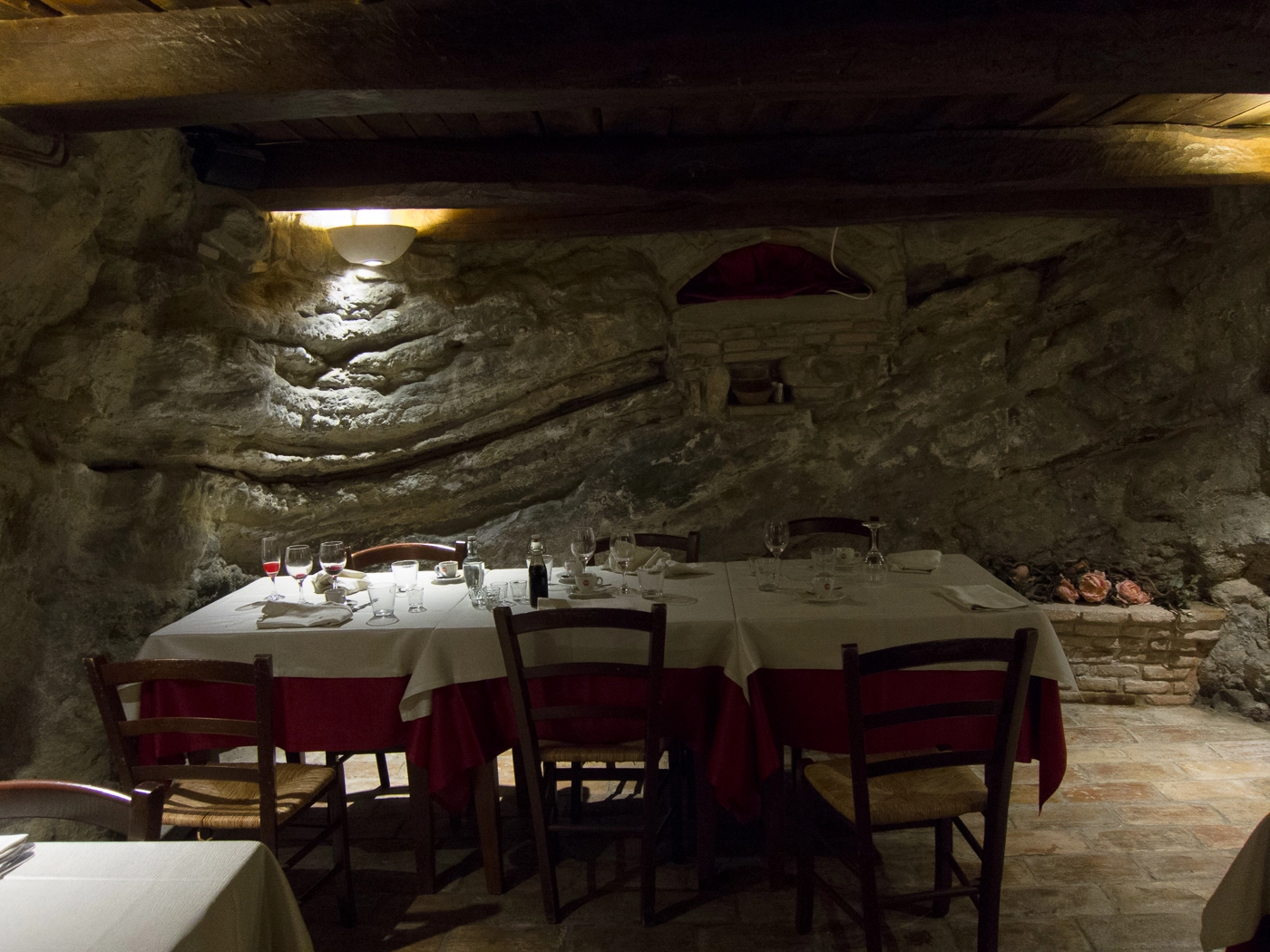 Si tratta di un ristorante semplicemente delizioso, con le sale ricavate dalle cantine scavate nel tufo, un menù che promette molto a prezzi modici e soprattutto un gestore gentilissimo che, complice magari la fredda giornata di pioggia senza troppi clienti, si ferma con noi a spiegarci il formaggio, le fosse e la tradizione senza ovviamente dimenticare una piccola degustazione per i suoi ospiti. Il formaggio di Talamello ha un sapore non troppo aggressivo, forse perché le fosse di Talamello rispetto a quelle di Sogliano sono meno umide; mentre ci spiega questi dettagli ed i segreti della produzione, assaggiamo piccoli saporiti pezzi del prezioso formaggio mentre siamo in piedi sopra la copertura di vetro dell'antica fossa aperta. Peccato non aver mangiato nella locanda, lo farò sicuramente se mi capiterà di tornare in zona.