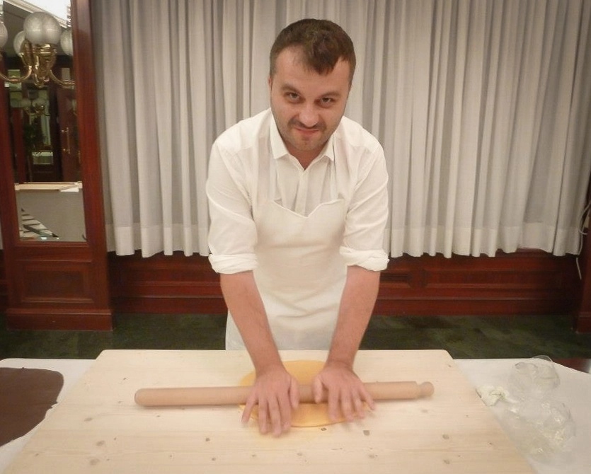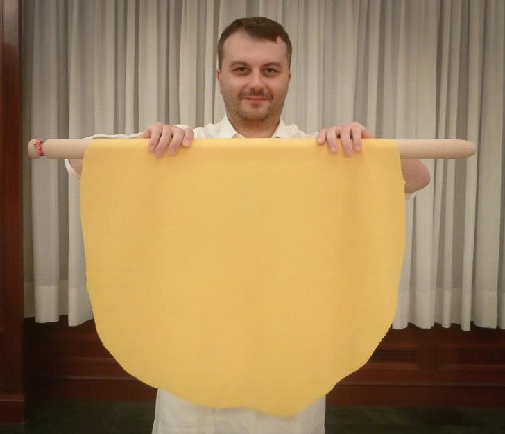 È ora di lavorare al mattarello e, non chiedetemi perché, ma tirare la pasta mi viene molto meglio che lavorarla. Grazie a Rina imparo quanto è semplice la tecnica di arrotolare la pasta sul mattarello per stenderla fine. Guardo soddisfatto la mia prima stesa: un'orecchia di elefante da 2 uova fatta di pasta al cacao. Comincio a pensare come la condirò... ci vuole un gusto forte e contrapposto al dolce. Ma è già ora di passare a stendere la pasta di 5 uova, in pochi minuti diventa più grande del mattarello stesso.