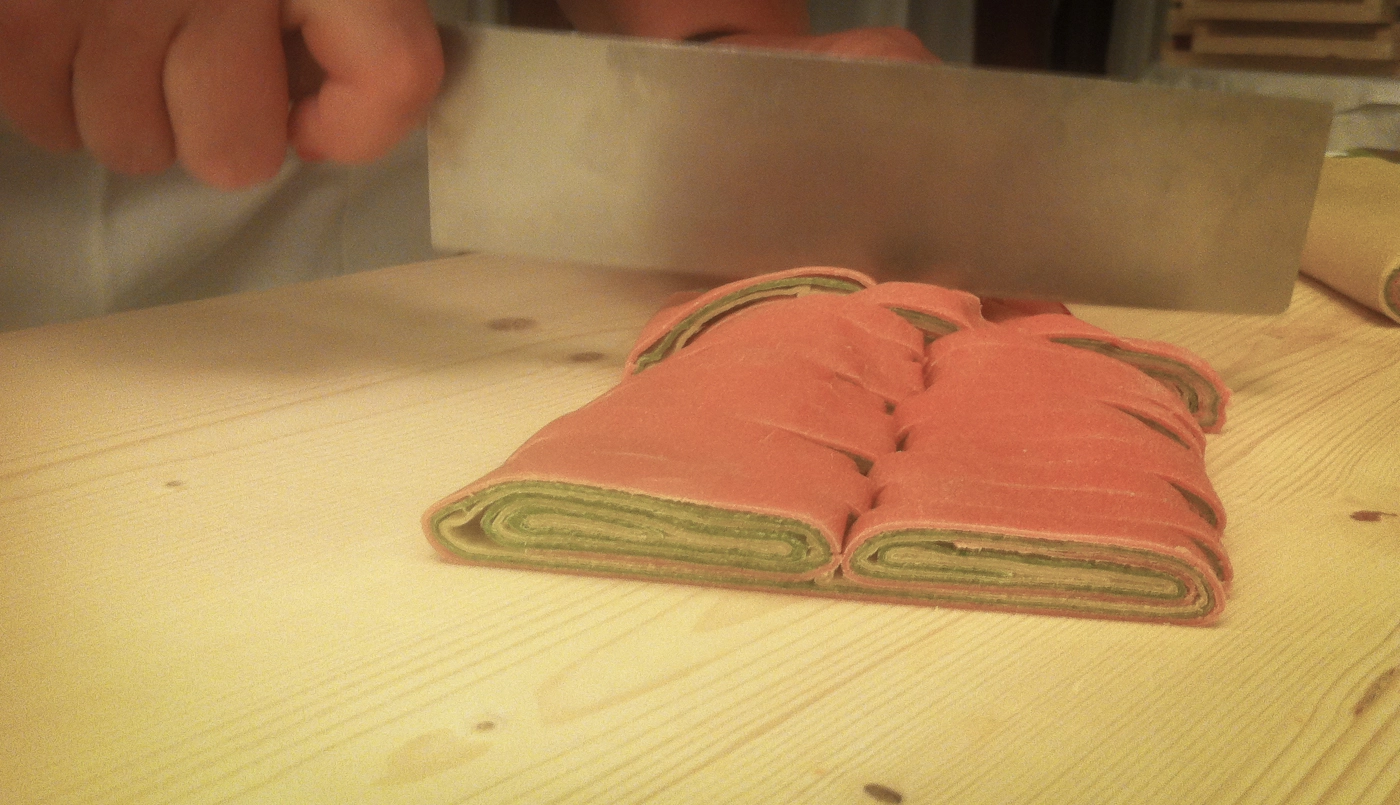 In chiusura altri piccoli-grandi gesti da imparare: tagliare le tagliatelle. 6/7 mm per una misura classica bolognese. Inutile descrivervi come piegare la pasta, tagliarla, infilarla col coltello ed aprire una bella distesa di tagliatelle in un colpo solo: va provato! Torno a casa con i frutti del mio operato: due vassoi sono al cacao. Dovrete aspettarvi due cose in futuro: qualche ardita ricetta con le tagliatelle al cacao e un post sulla prossima lezione, le paste ripiene!