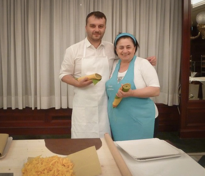 Lo ammetto, mi sono perso la prima lezione sulla base della sfoglia; ma in poche parole Rina ti spiega le basi dell'impasto e dell'impastare e sono pronto ad andare al mio tavolo per mettere subito le mani in pasta. L'insegnate è Rina Poletti, sfoglina professionista, l'ambiente è il prezioso ristorante Neoclassico e la compagnia è calda e amichevole. Il nostro obiettivo: le tagliatelle multicolori.
