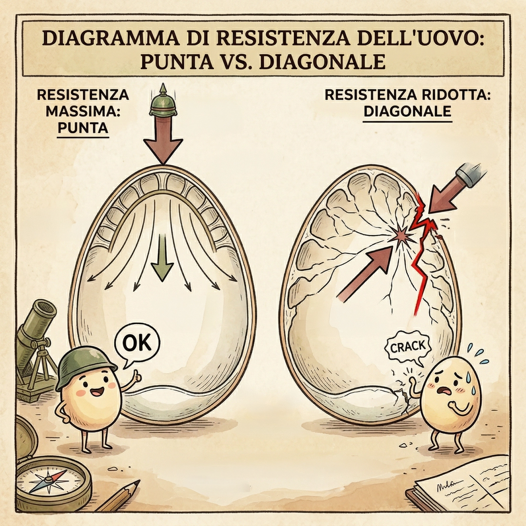 Un uovo non è solo un uovo, è una meraviglia ingegneristica di carbonato di calcio. Per vincere, dovete pensare come un architetto/ingegnere. Magari il lettore che ha fatto studi di statica troverà le prossime indicazioni banali, ma per tutti gli altri ho tentato di semplificare in un piccolo manuale.