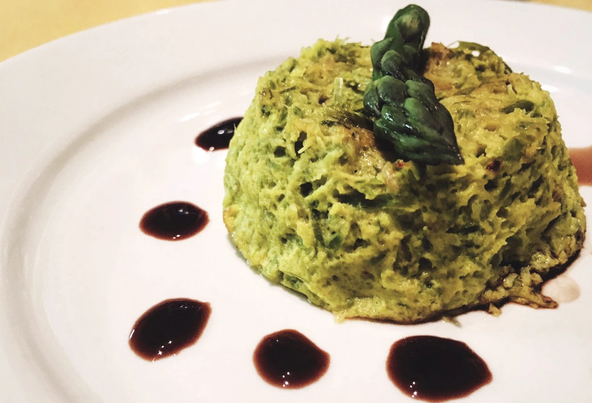 5. Riporre i budini direttamente sul piatto di portata, bagnare con un po' di aceto balsamico e decorare con le punte di asparagi e le scaglie di grana.