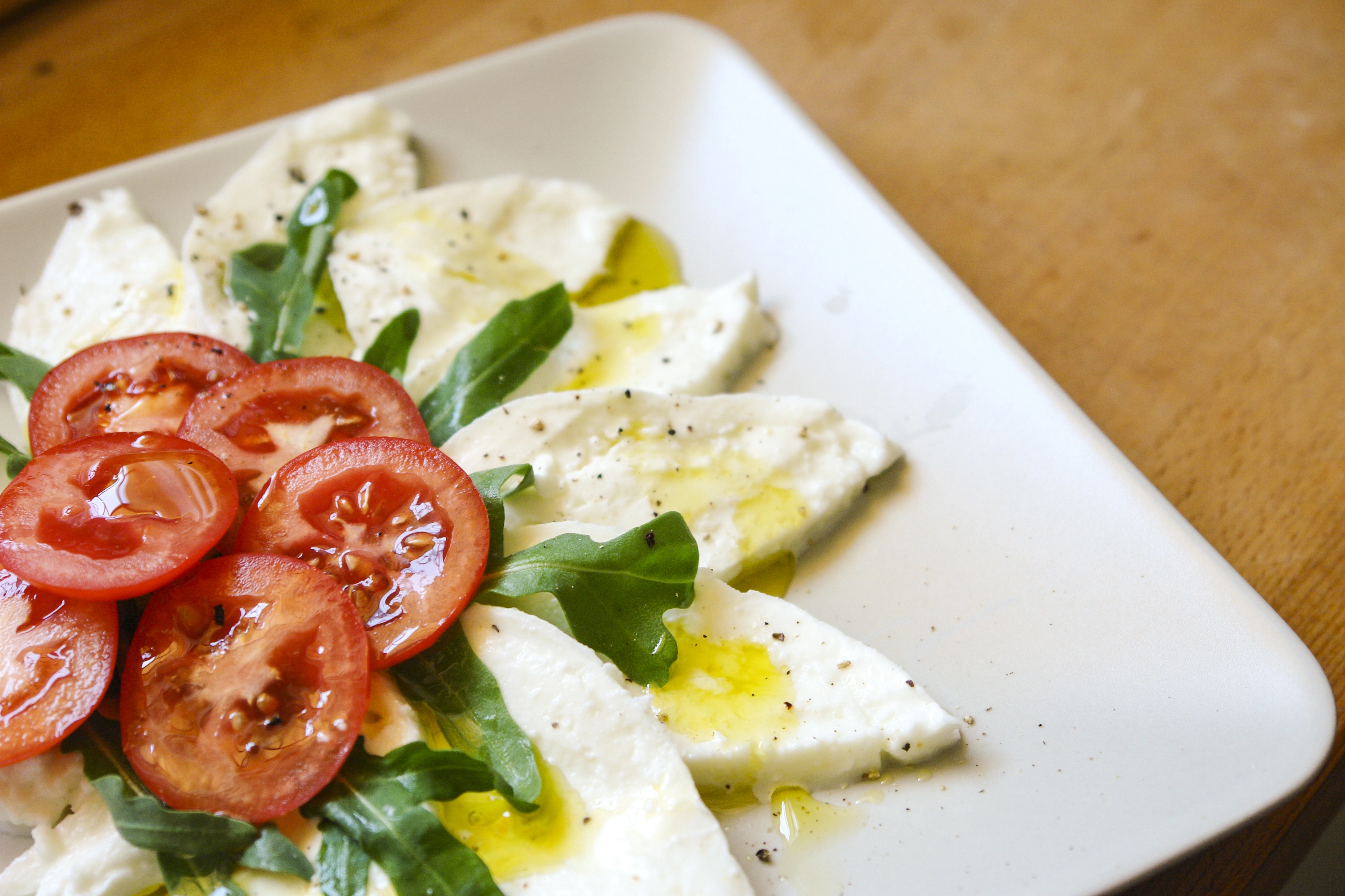 Tagliare la mozzarella, pulire la rucola, tagliare il pomodoro, grattare il pepe e condire con un filo d'olio. Fatto.