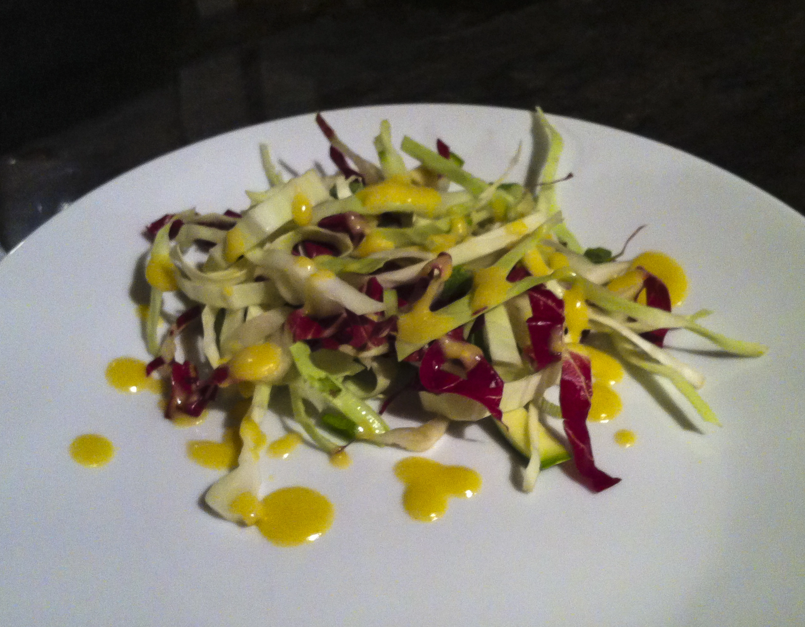 - Tagliare cavolo, zucchine e radicchio a julienne.
