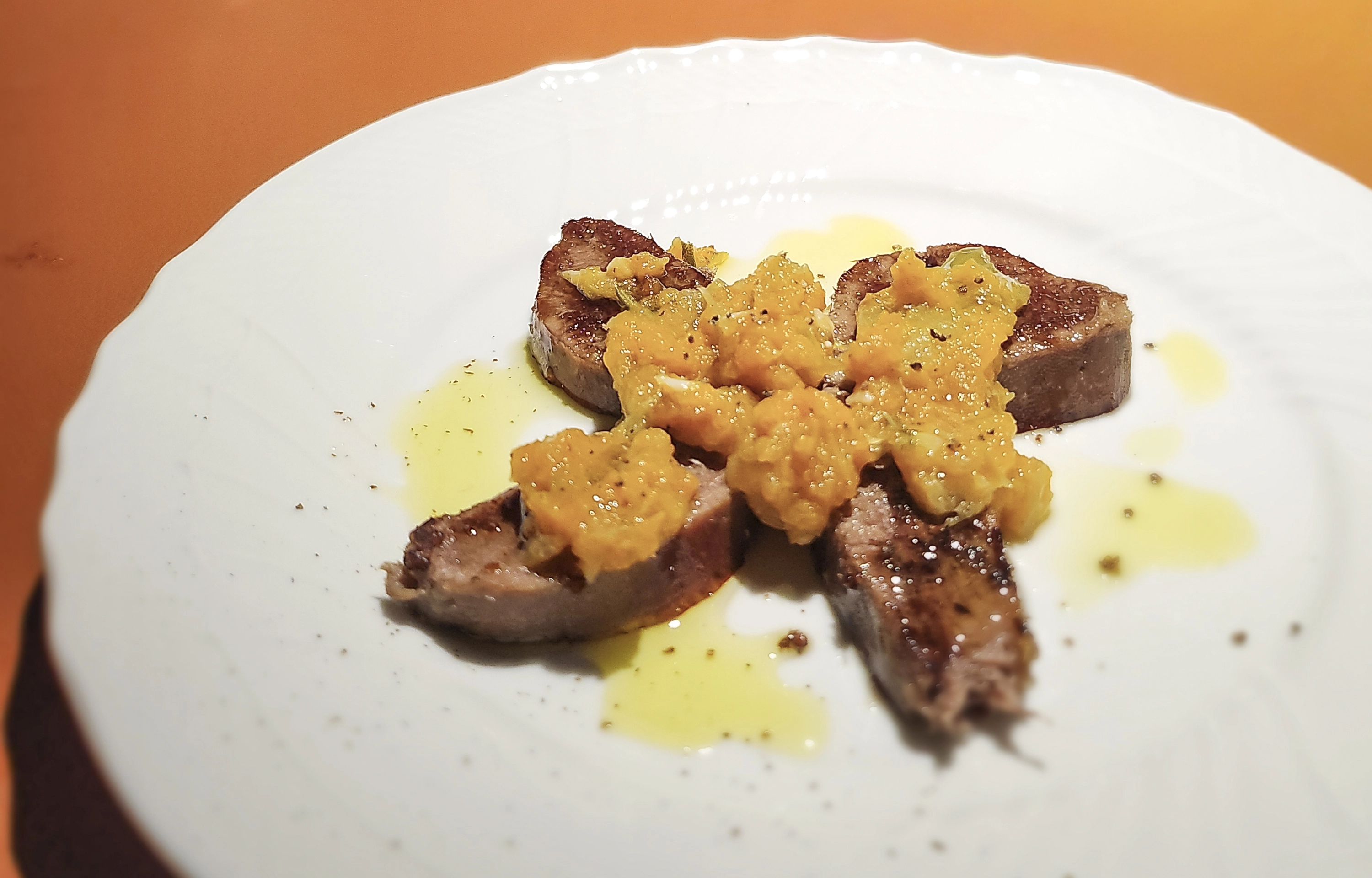 - Impiattare le fette scottate cospargendole con la salsa di verdure, un filo d'olio a crudo e una grattugiata di pepe nero.