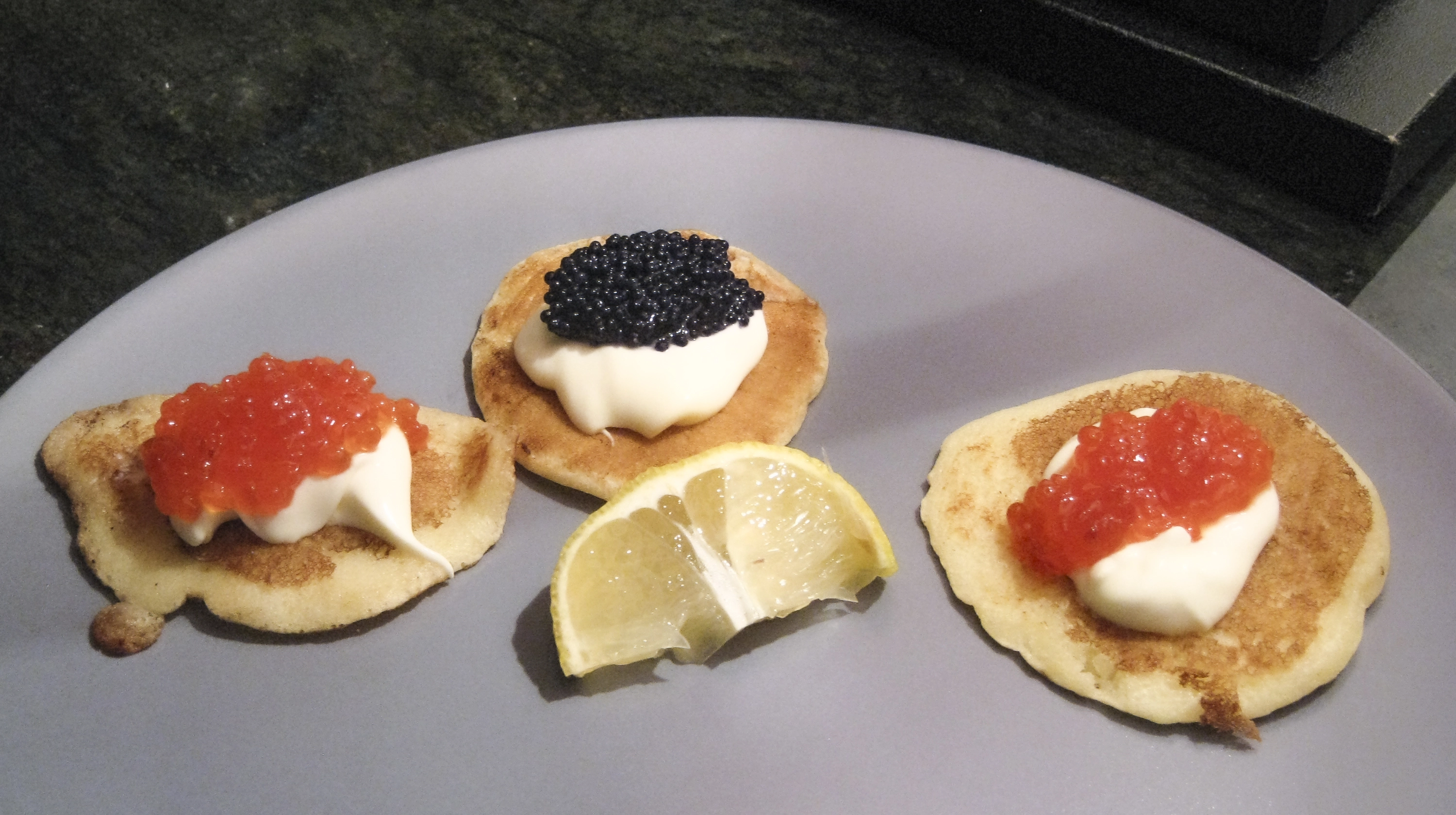 - Cotti i blinis che vi servono, metteteli sul piatto di portata aggiungendo su ogni frittella una cucchiaiata di panna acida e delle uova di pesce a piacere. Guarnire con uno spicchio di limone, da spremersi o no sulle uova secondo il gusto dei vostri commensali. Vanno mangiati con le mani, piegandoli a metà ed in due morsi al massimo.