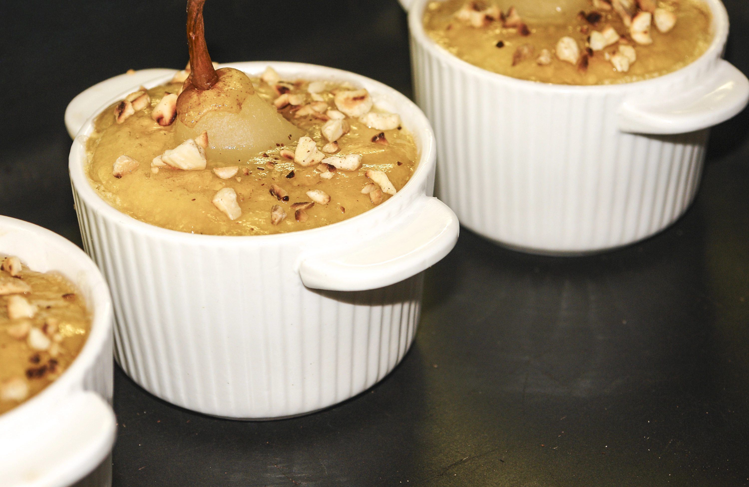 4. Imburrare le cocotte, riporvi una pera bollita, aggiungere l'impasto, spolverare con la granella di mandorle. Cuocere in forno a 200°C per 20 minuti.