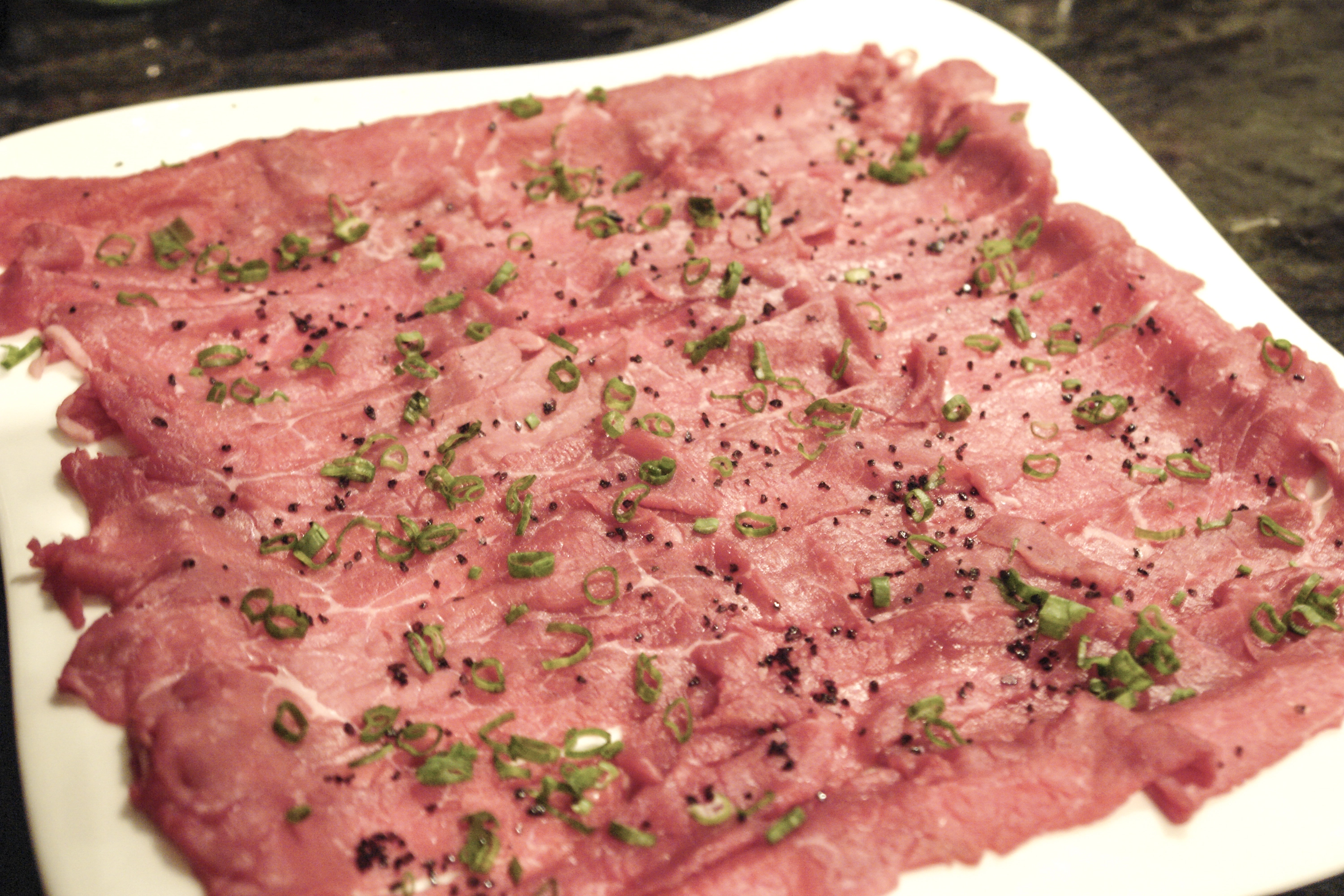 - Tagliate finemente il cipollotto verde e disponetelo assieme al sale sul manzo.