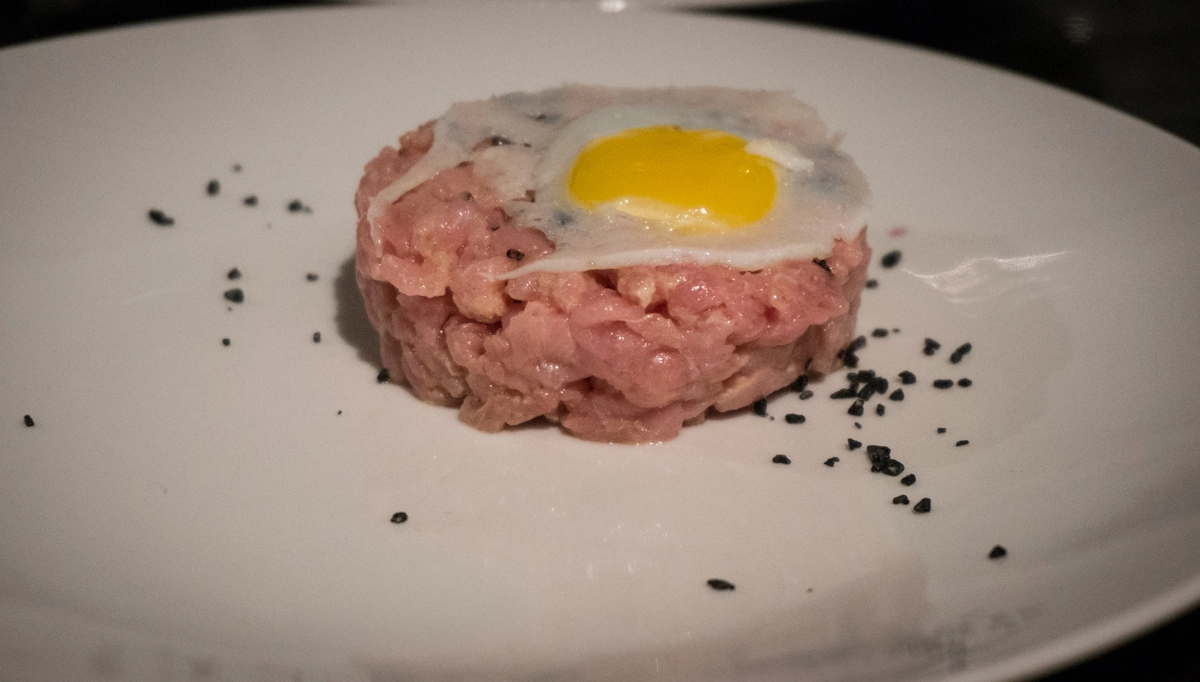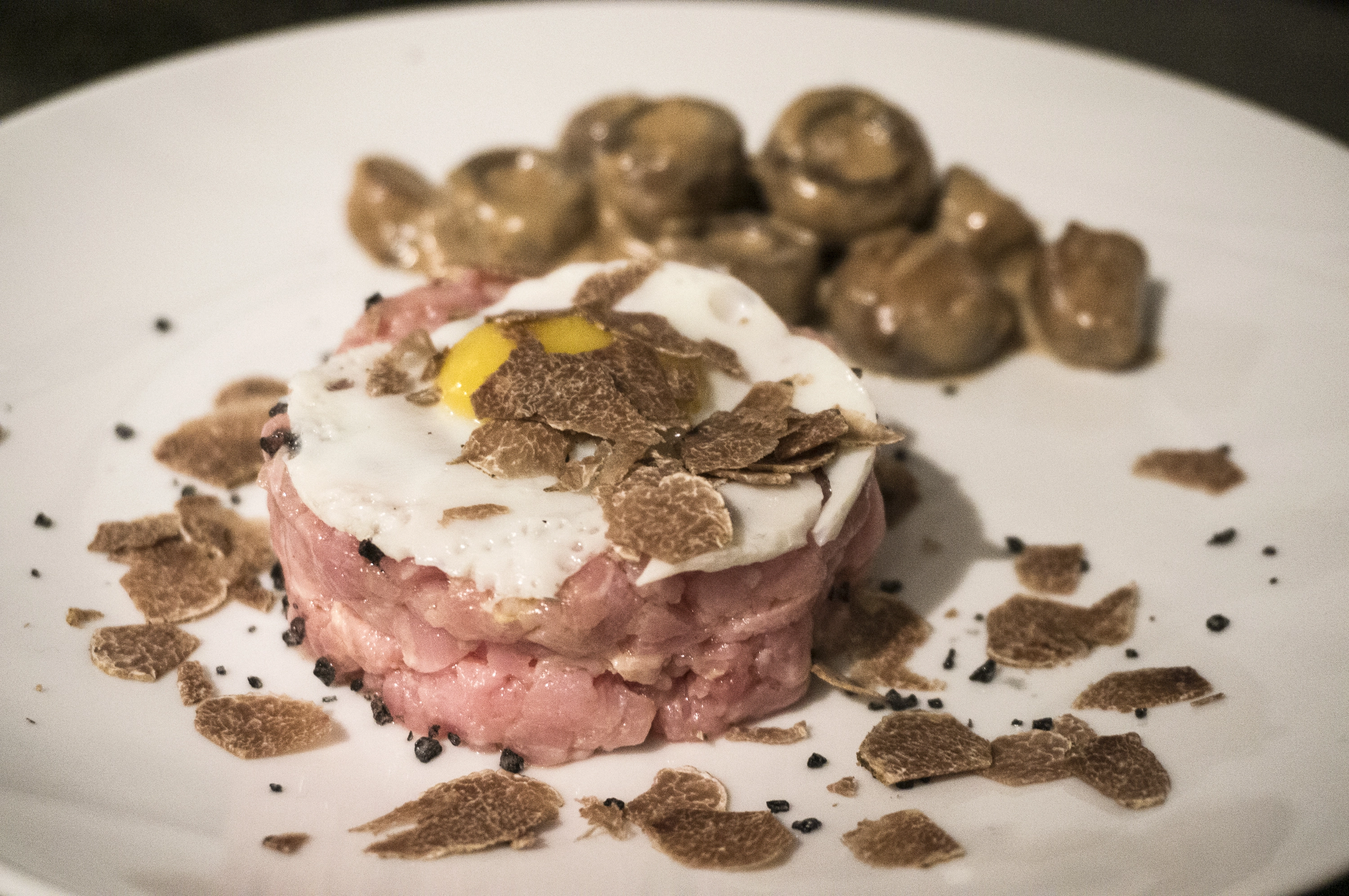 Il sapore del tartufo lega con il dolce della carne ed il piccante della senape, in una girandola di sapori impiattati in un cilindro da food design.