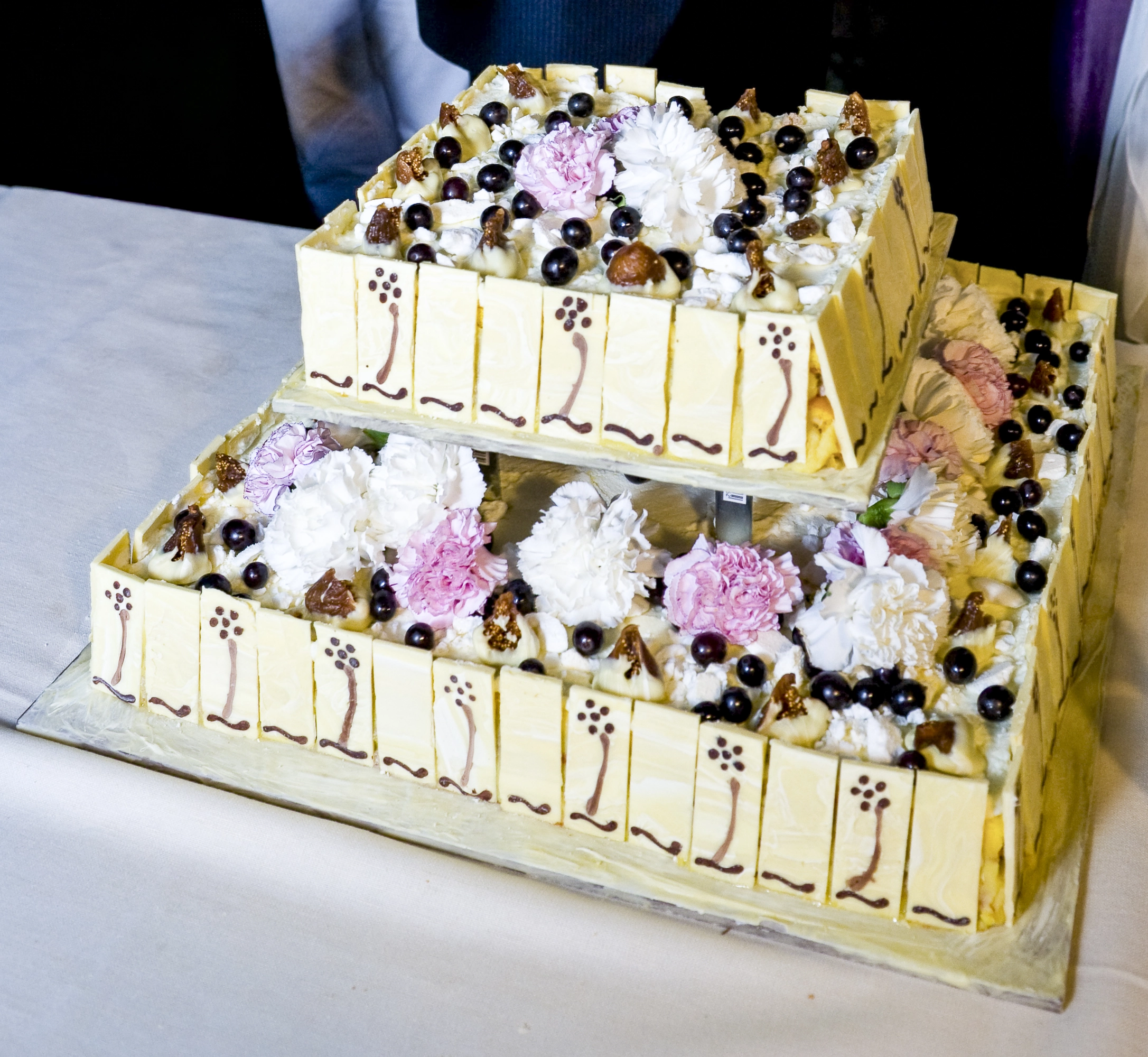 - Decorate la superficie con le guglie di fichi secchi, qualche acino d'uva fragola, scagliette di cioccolato bianco (ne avanzeranno un bel po' dal taglio delle tavolette) e con dei fiori.