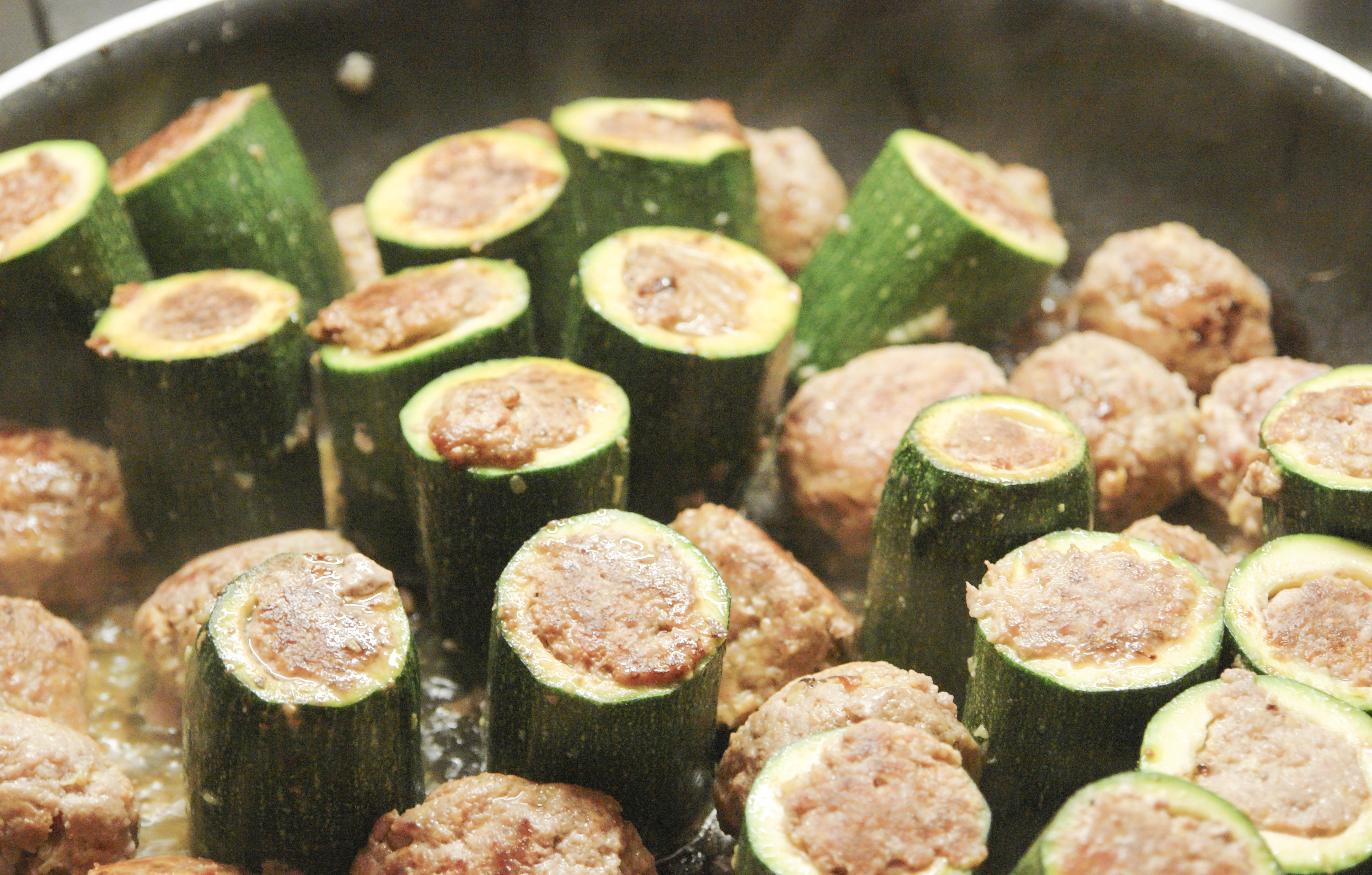 - Saltare zucchine e polpette nella padella in cui avete saltato l'interno aggiungendo olio. Abbiate l'accortezza di saltare le zucchine ripiene anche in verticale per scottare il ripieno.